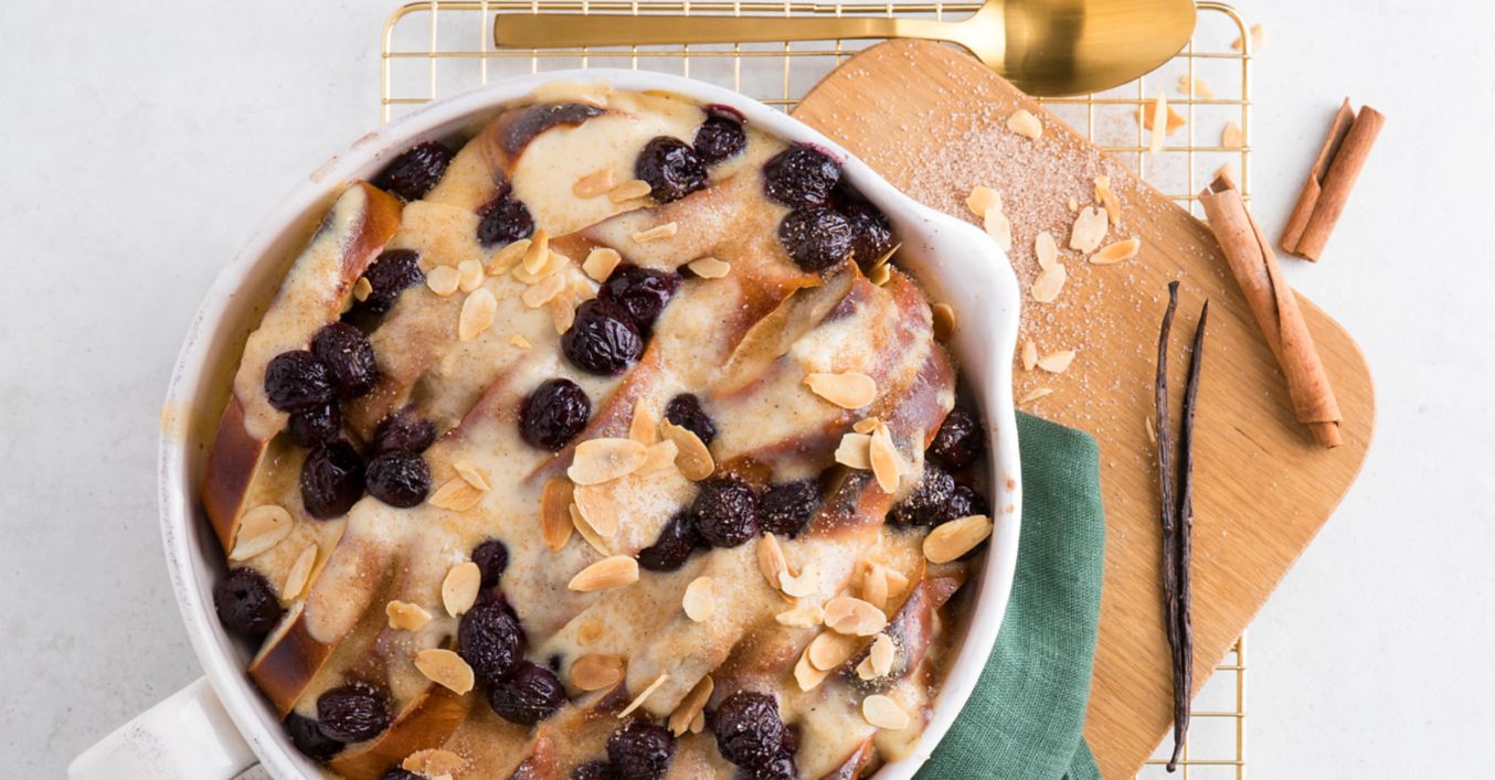 Die Hälfte der Vanillesoße und der Kirschen in der Auflaufform verteilen und die Butterzopf-Scheiben fächerartig einlegen. Übrige Soße gleichmäßig über die Butterzopf-Scheiben gießen, mit restlichen Kirschen belegen und im vorgeheizten Ofen auf der mittleren Schiene circa 30 Minuten backen.