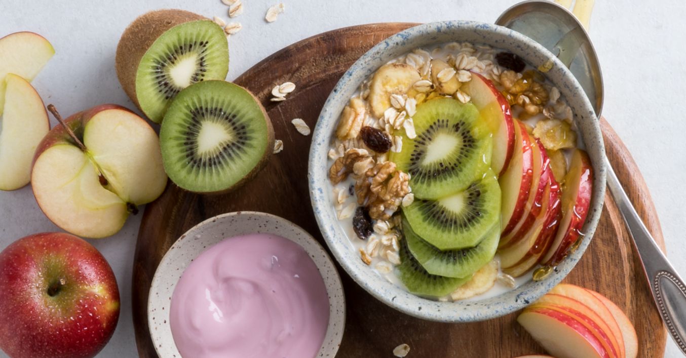 Kiwi schälen und in dünne Scheiben schneiden. Äpfel waschen, halbieren, entkernen und in Spalten schneiden. Müsli auf Teller anrichten und Obst darauf verteilen.