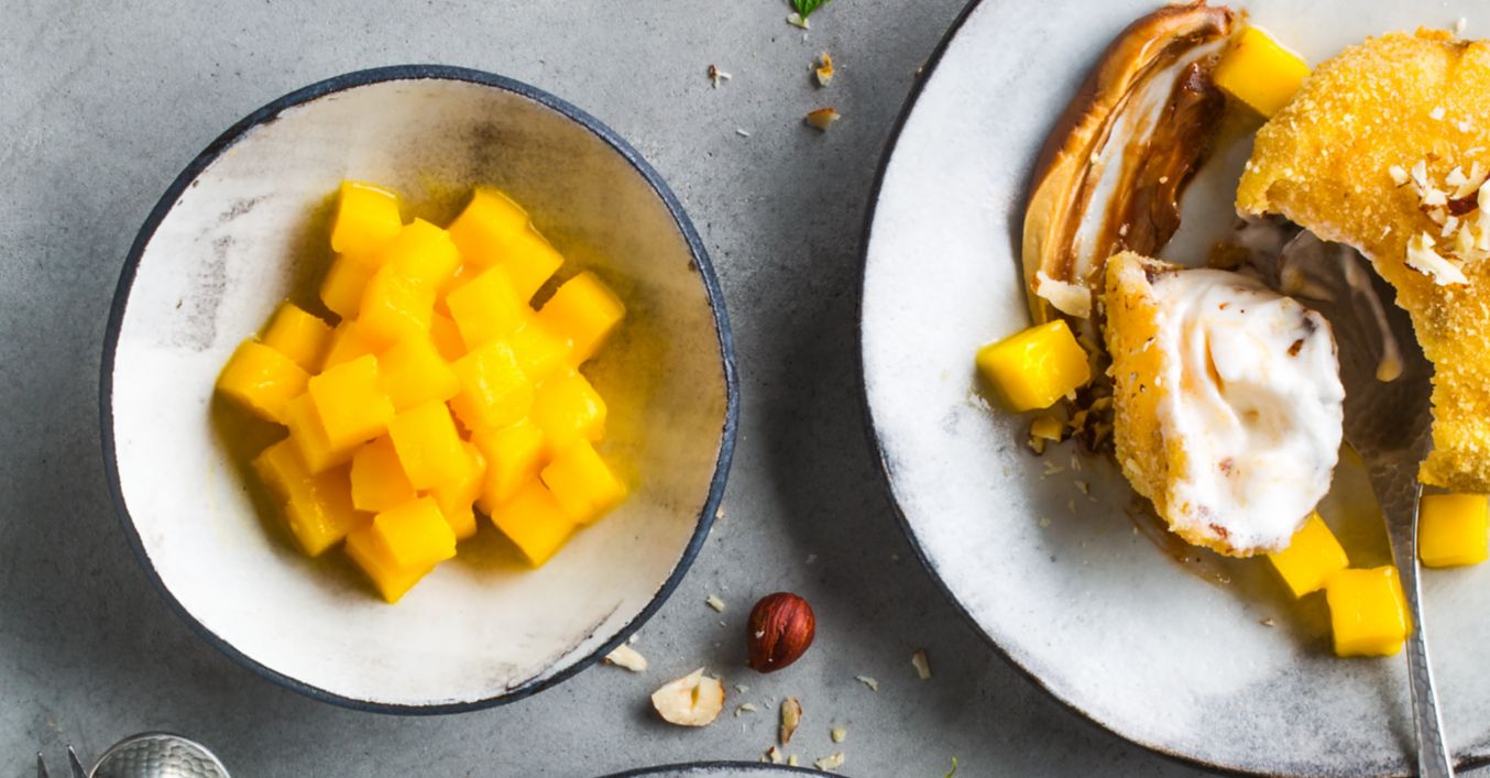 Öl in einem großen Topf auf 175 °C erhitzen. Das Bratapfeleis darin für circa 30 Sekunden frittieren. Bratapfeleis auf Tellern anrichten, mit Mangowürfeln, Haselnüssen und Karamellcreme garniert servieren.