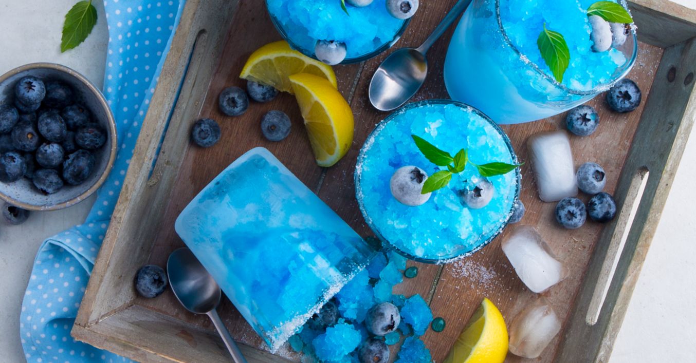 Zitrone auspressen, Saft mit Eiswürfeln und Blue Curaçao in einem Standmixer pürieren.