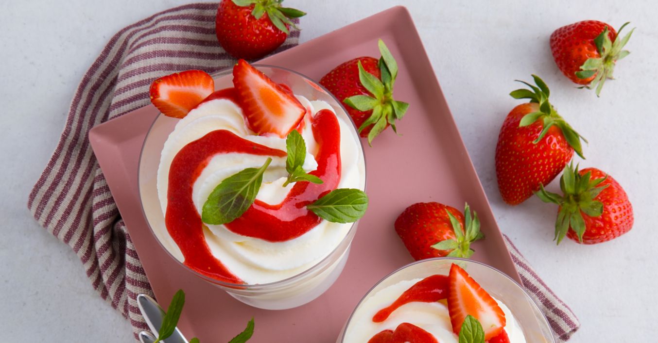 Joghurtmasse in einen Spritzbeutel geben und in vier Dessertschälchen füllen. Mit Beerensoße, restlichen Beeren und nach Wunsch mit Minzblättchen garniert servieren.