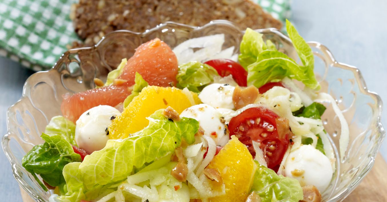 Nüsse grob hacken und in einer beschichteten Pfanne goldbraun rösten. Salat in Blätter zerteilen, waschen, putzen und in mundgerechte Stücke zupfen. Grapefruits und Orangen schälen und filetieren. Kohlrabi ebenfalls schälen und grob raspeln.