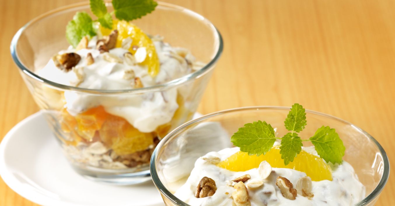 Aprikosen in kleine Würfel schneiden. Orangen schälen, filetieren und die Filets in Stücke schneiden. Bananen schälen und in Scheiben schneiden. Früchte mit Honig und Zitronensaft marinieren.
