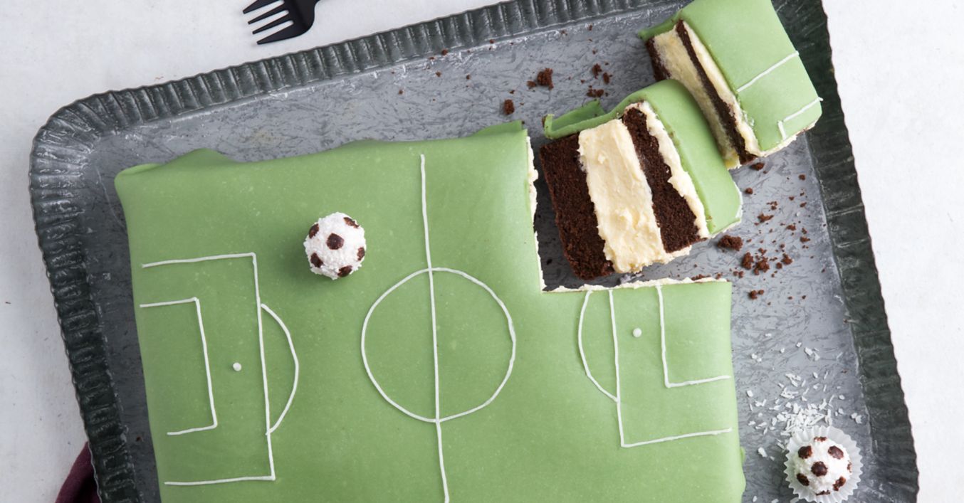 Mit weißer Lebensmittelfarbe Fußballfeldmarkierungen auf den Kuchen zeichnen.