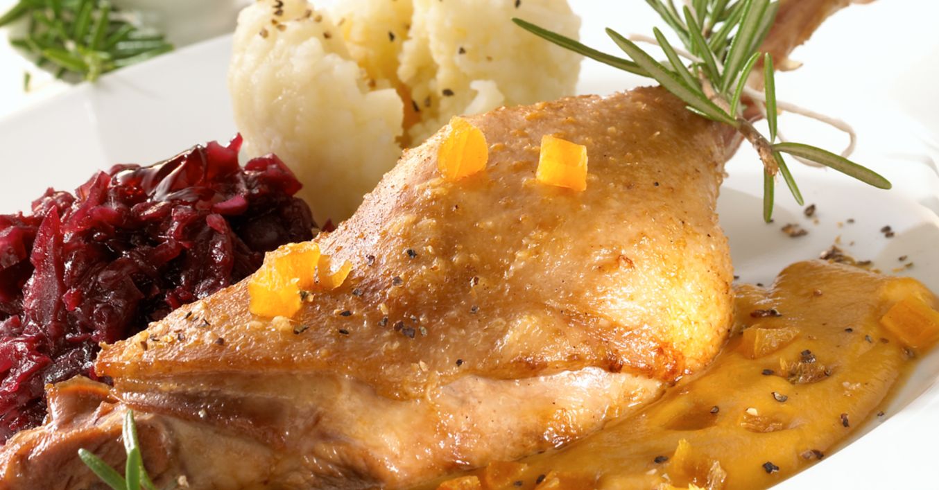 Gänsekeulen mit Sauce und Rotkohl anrichten. Nach Wunsch mit Thüringer Kartoffelklößen und mit Rosmarin garniert servieren.