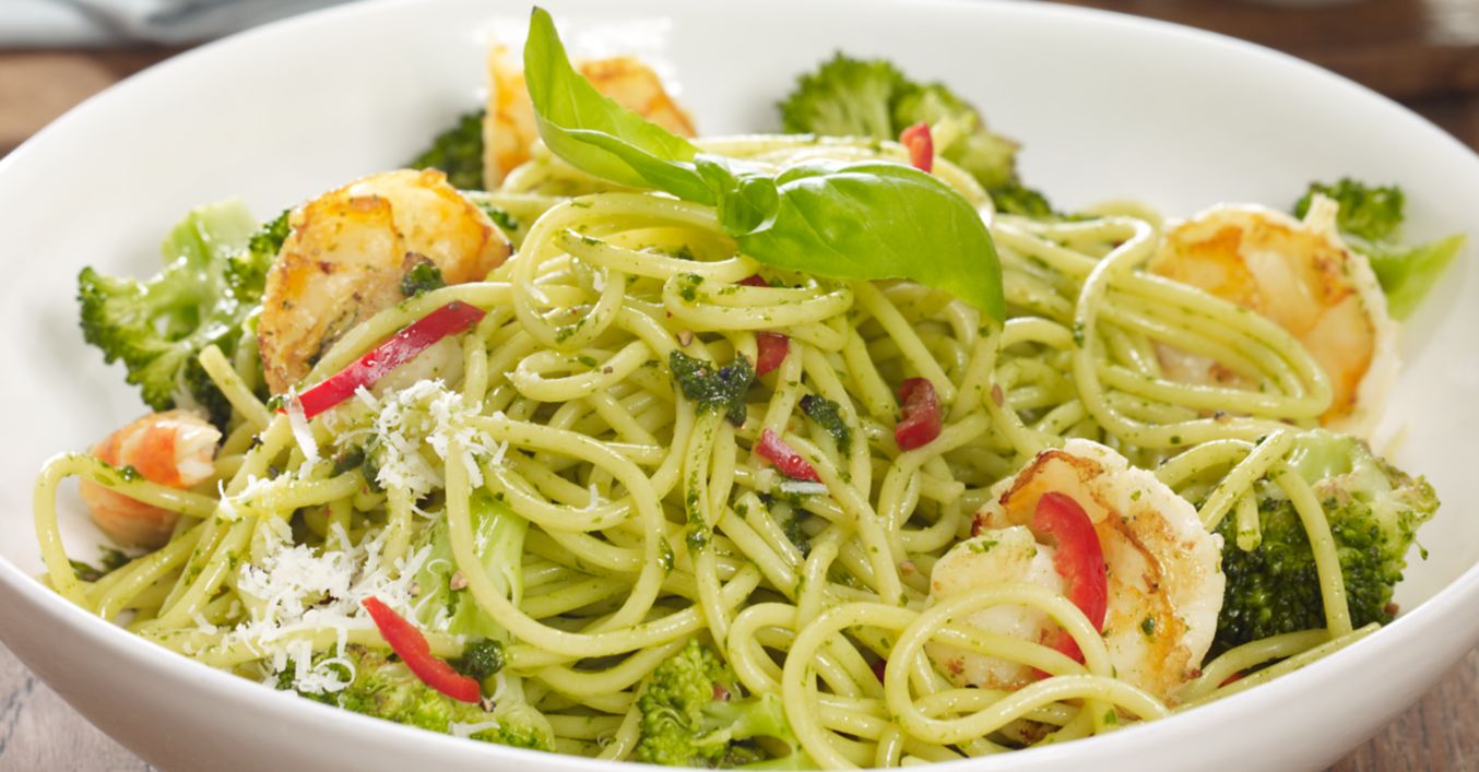 Nudeln, Garnelen, Chilischote, Brokkoli und Basilikumöl vermischen und auf Teller anrichten. Mit Parmesan bestreuen, mit Basilikum garnieren und servieren.