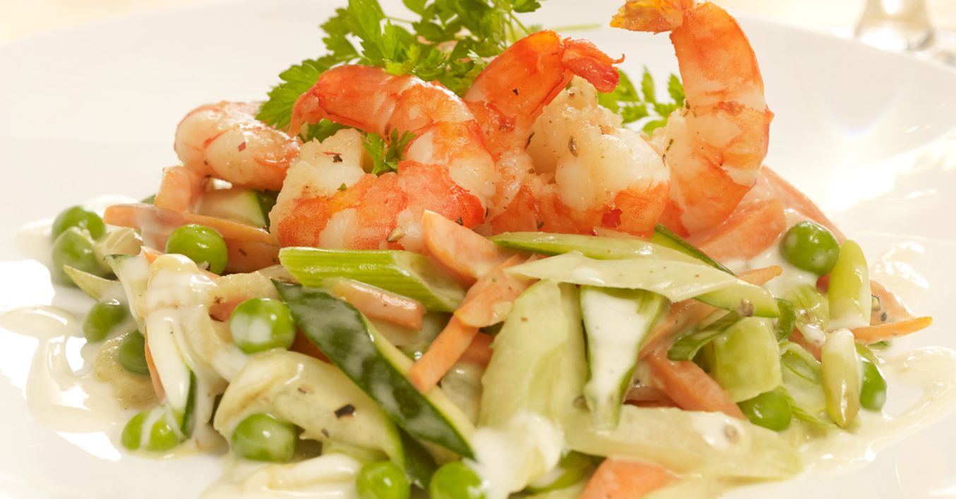 Garnelen mit Weißwein-Soße und Honig-Senf-Gemüse