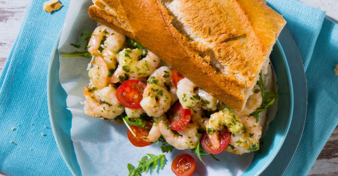Backofen auf 160 °C Umluft vorheizen. Garnelen in Aluschale für circa 10 Minuten in den Backofen geben. Baguette längs durchschneiden und mit Salatmayonnaise bestreichen.