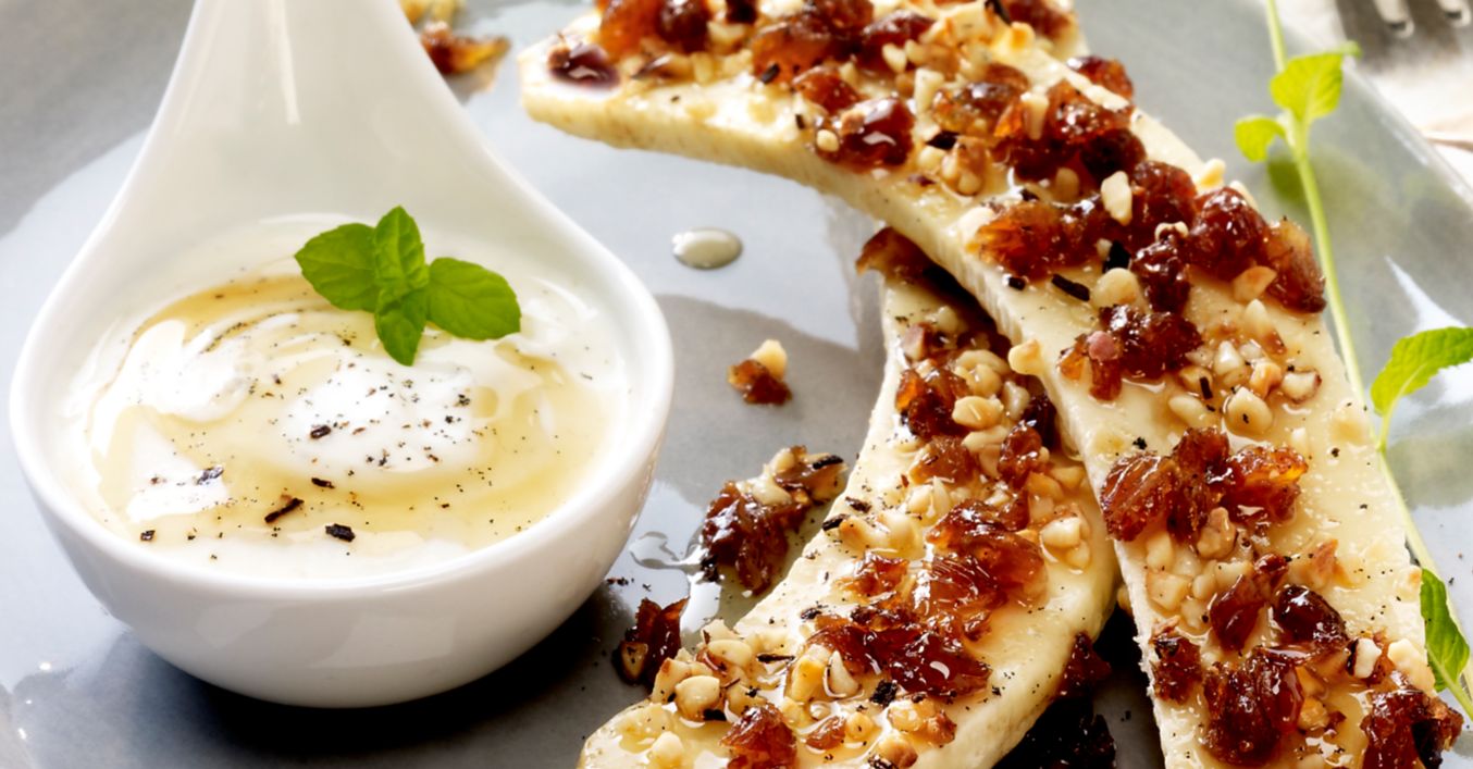 Bananen schälen, der Länge nach halbieren, erst mit etwas Zitronensaft und dann mit Honig beträufeln.