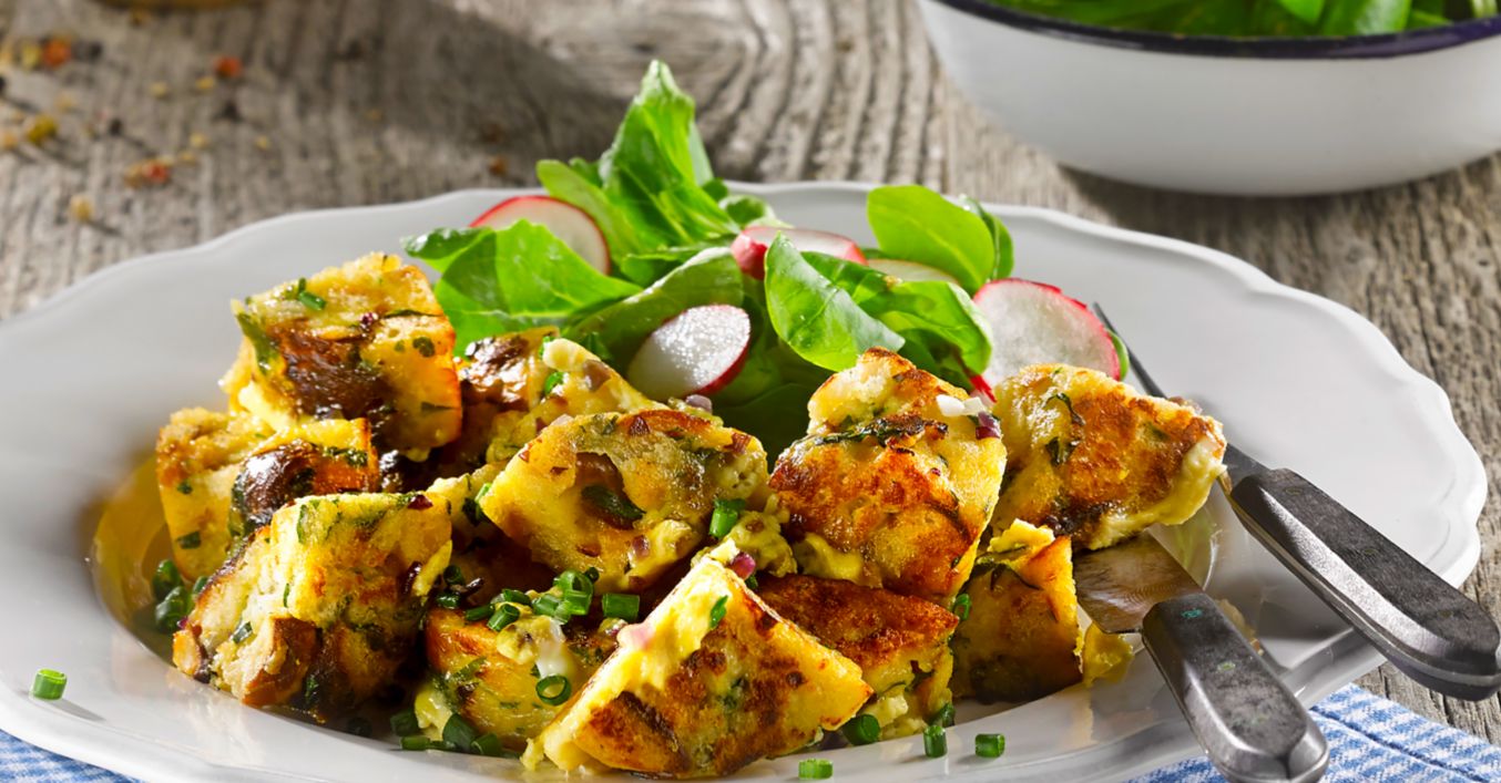 Butter in einer großen Pfanne schmelzen und Semmelknödel darin kräftig anbraten. Zwiebelwürfel zugeben und andünsten. Die Eiermischung darüber geben und unter Rühren stocken lassen.