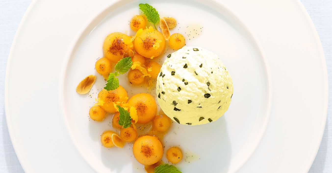 Eis zu Kugeln portionieren, mit gebratener Melone auf Teller anrichten, mit Mandelblättchen bestreuen und servieren.