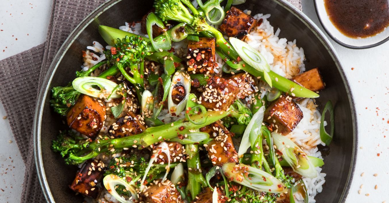 Reis auf 2 Schüsseln verteilen, Brokkoli und Tofu darauf anrichten und mit der übrigen Soße und nach Wunsch mit geröstetem Sesam und Lauchzwiebeln bestreut servieren.