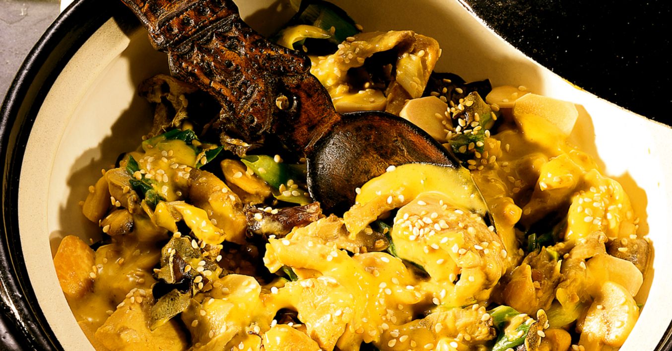 Austernpilze, Champignons und Frühlingszwiebeln putzen. Austernpilze in Streifen, Champignons vierteln, Frühlingszwiebeln waschen und in Ringe schneiden. Knoblauchzehen abziehen und fein hacken. Zitronengras waschen. Alles zum Fleisch geben und mit Salz, Pfeffer, Zucker, Soja- und Fischsoße abschmecken. Kokosmilch und Hühnerbrühe zugeben und ca. zehn Minuten schmoren lassen. Currypulver untermischen und Zitronengras entfernen.