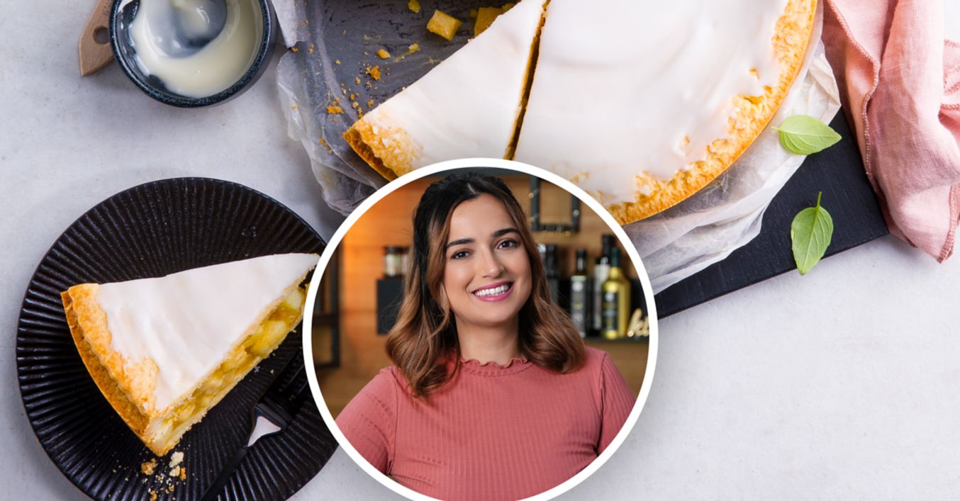 Boden einer Springform (26 Zentimeter Durchmesser) mit Frischhaltefolie auslegen. Gekühlten Mürbeteig für einige Sekunden geschmeidig kneten. Ein Drittel des Teiges gleichmäßig auf der Frischhaltefolie ausbreiten. Frischhaltefolie samt Mürbeteig auf eine Tortenplatte ziehen und bis zur Weiterverarbeitung in den Kühlschrank legen. Dieser dient später als Teigdeckel.