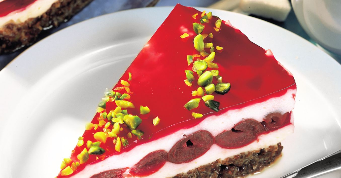 Rote Gelatine nach Packungsanweisung einweichen, auflösen, mit Kirschsaft verrühren, als dünne Schicht über die Torte gießen und in die Tiefkühlung stellen. Die Torte gut gekühlt und mit Pistazien bestreut servieren.