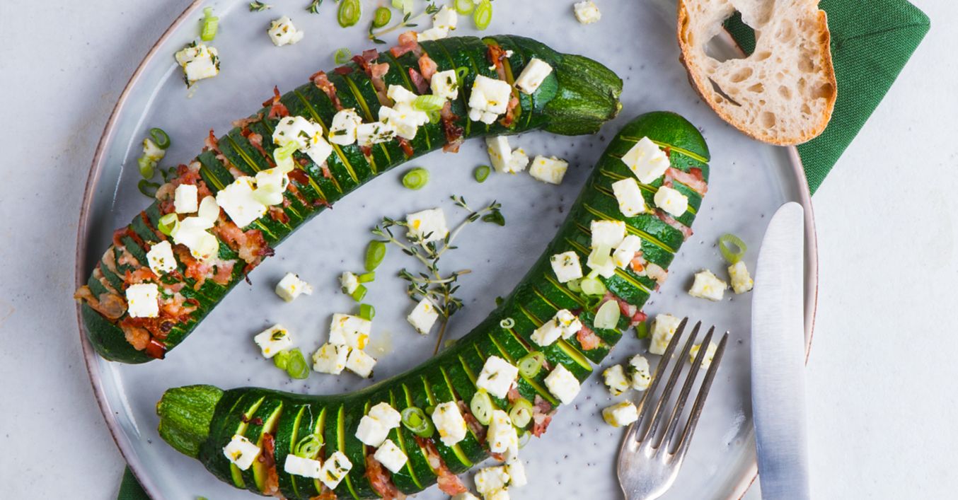 Grill vorheizen. Zucchini waschen und dicht an dicht einschneiden, aber nicht durchschneiden. Bacon und getrocknete Tomaten zwischen den Spalten der Zucchini verteilen. Auf dem heißen Grill oder in einer Grillschale circa 15 Minuten mit geschlossenem Deckel grillen.