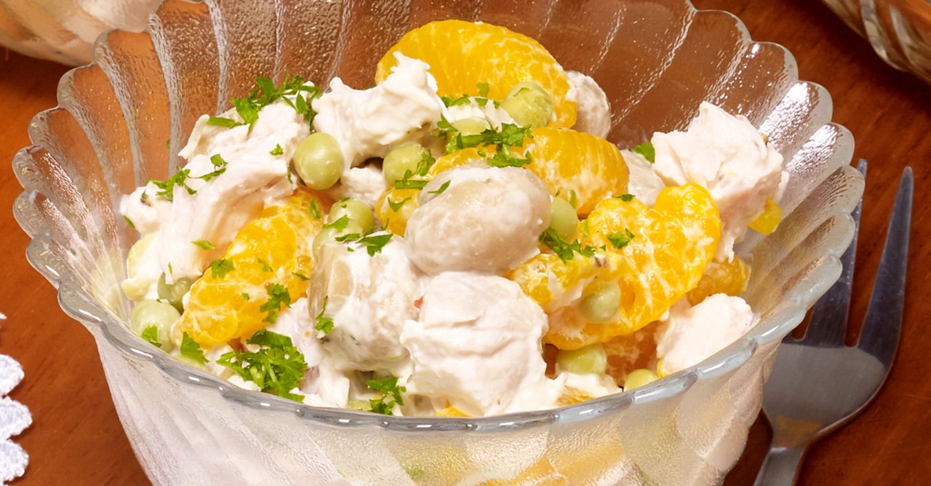 Hühnerfleisch, Mandarinen, Champignons und Erbsen mit dem Dressing vermischen, in Glasschalen füllen, mit Petersilie garnieren und servieren.