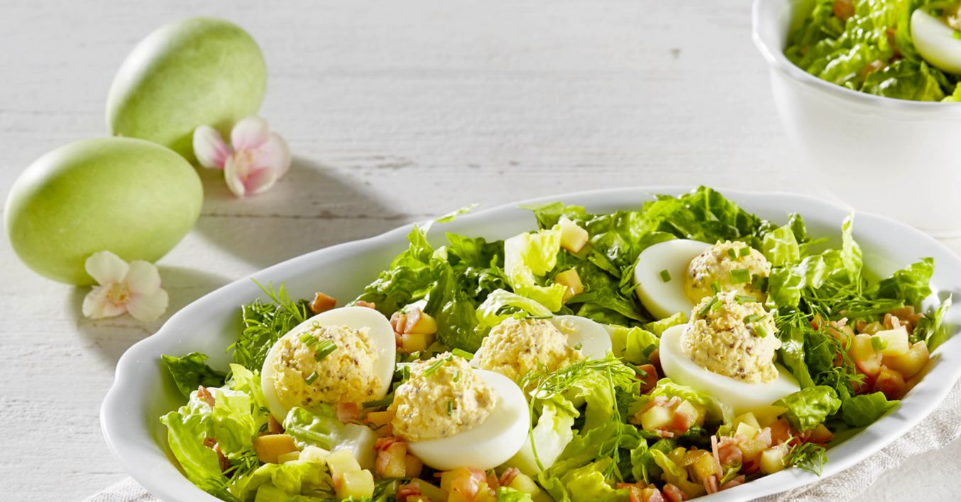 Den Kräutersalat mit dem Dressing marinieren und auf Tellern anrichten. Die gefüllten Eier darauf verteilen und mit den Schinken- und Apfelwürfeln bestreuen.