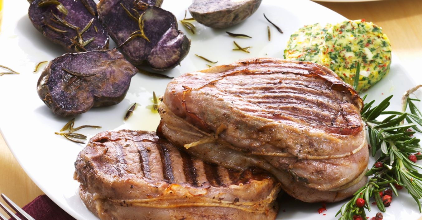 In jedes Filetsteak eine Tasche schneiden und jeweils mit einer Scheibe Kräuterbutter füllen. Mit wenig Salz und Pfeffer beidseitig würzen. Den Rand der Steaks mit 2 bis 3 Speckscheiben umwickeln und mit Küchengarn festbinden. Die Filetsteaks bei mittlerer Hitze je nach gewünschtem Garpunkt grillen.