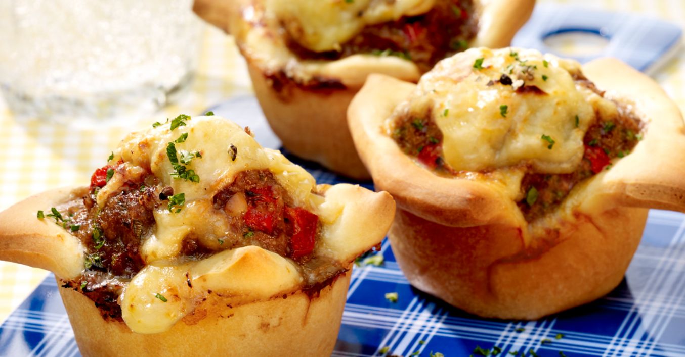 Hackfleischmischung zu Bällchen formen und in die Mitte der Bällchen einen Käsewürfel drücken. Bällchen verschließen und jeweils in die Mitte des Pizzateigs legen. Restlichen Käse überstreuen und im vorgeheizten Backofen bei 180 °C (Gas: Stufe 3, Umluft 160 °C) circa 30 bis 40 Minuten garen.