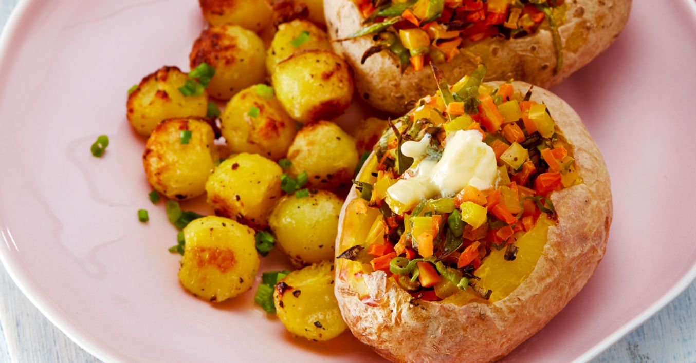 Ein Backblech mit Backpapier belegen. Die Gemüsefüllung in die Kartoffeln füllen und die Kartoffeln auf das Blech legen. Die gewürzten Kartoffelkugeln ebenfalls auf das Blech legen. Alles 15 bis 18 Minuten im Backofen backen.