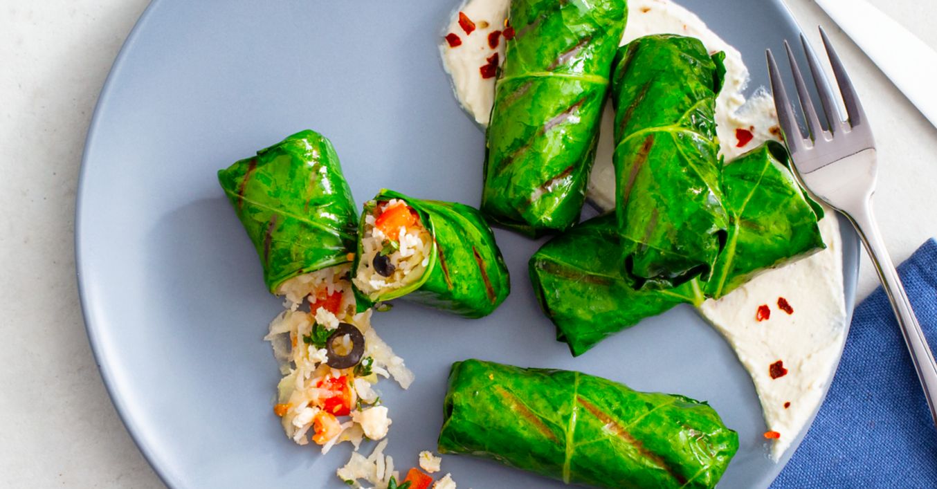 Gefüllten Kohlrabiblätter mit Olivenöl bestreichen und circa 8 Minuten von beiden Seiten bei mittlerer Hitze auf dem vorgeheizten Grill oder in der Pfanne garen.