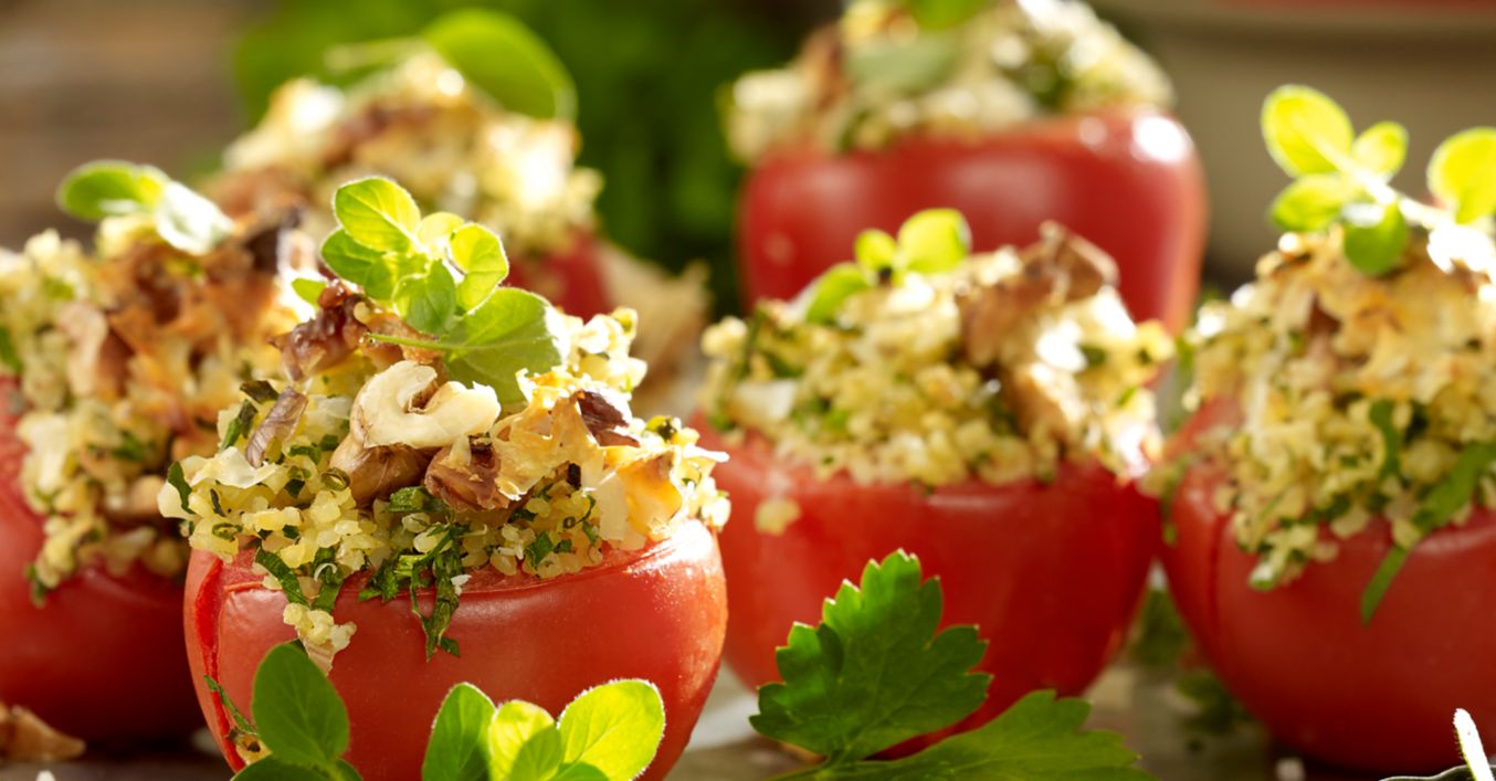 Bulgurmischung in die Tomaten füllen, in eine backofengeeignete Form setzen, mit Käse bestreuen und im vorgeheizten Backofen bei 180 °C (Gas: Stufe 3, Umluft 160 °C) circa 15 bis 20 Minuten garen.