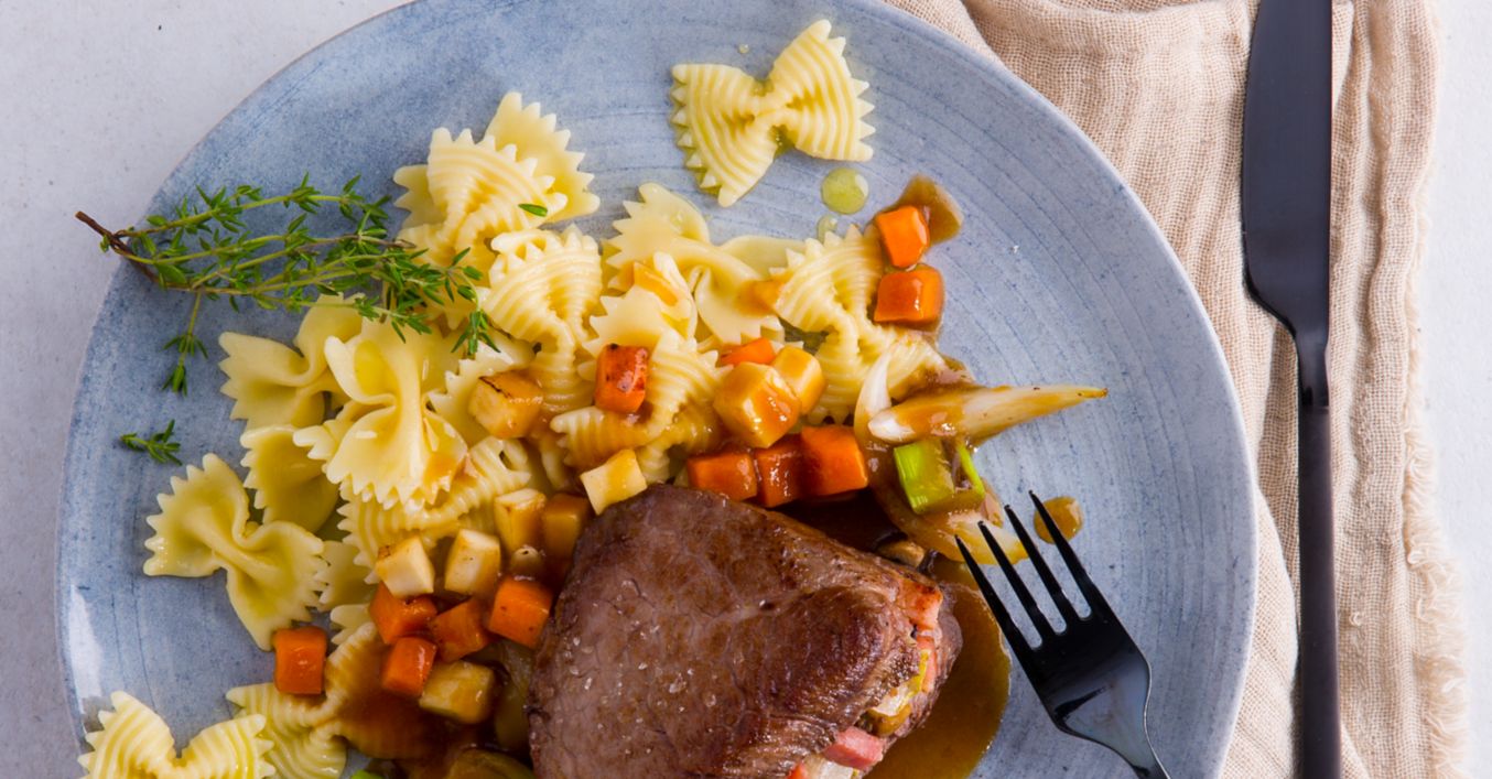 Die Nudeln in Salzwasser nach Packungsanleitung kochen, anschließend ein wenig in Butter schwenken und mit den gefüllten Filetsteaks und dem Gemüse anrichten.