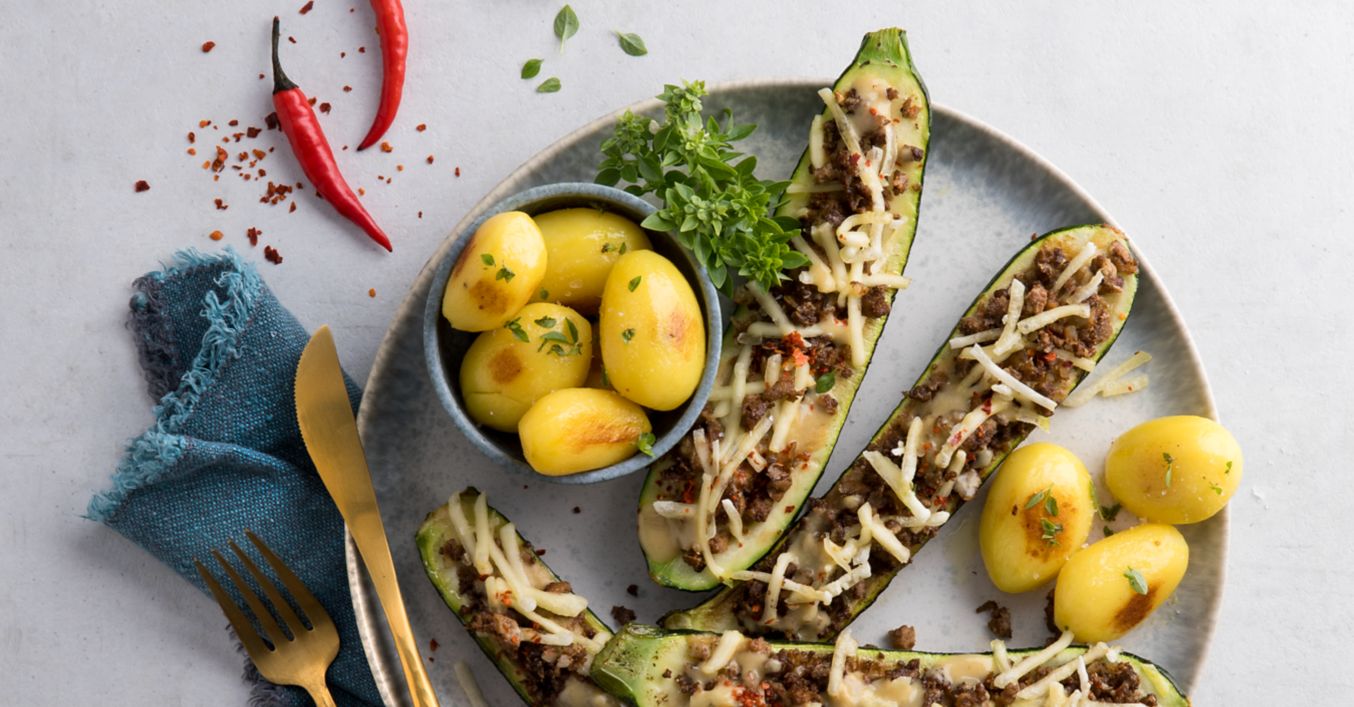 Gefüllte Zucchini und Kartoffeln auf Teller anrichten und servieren.
