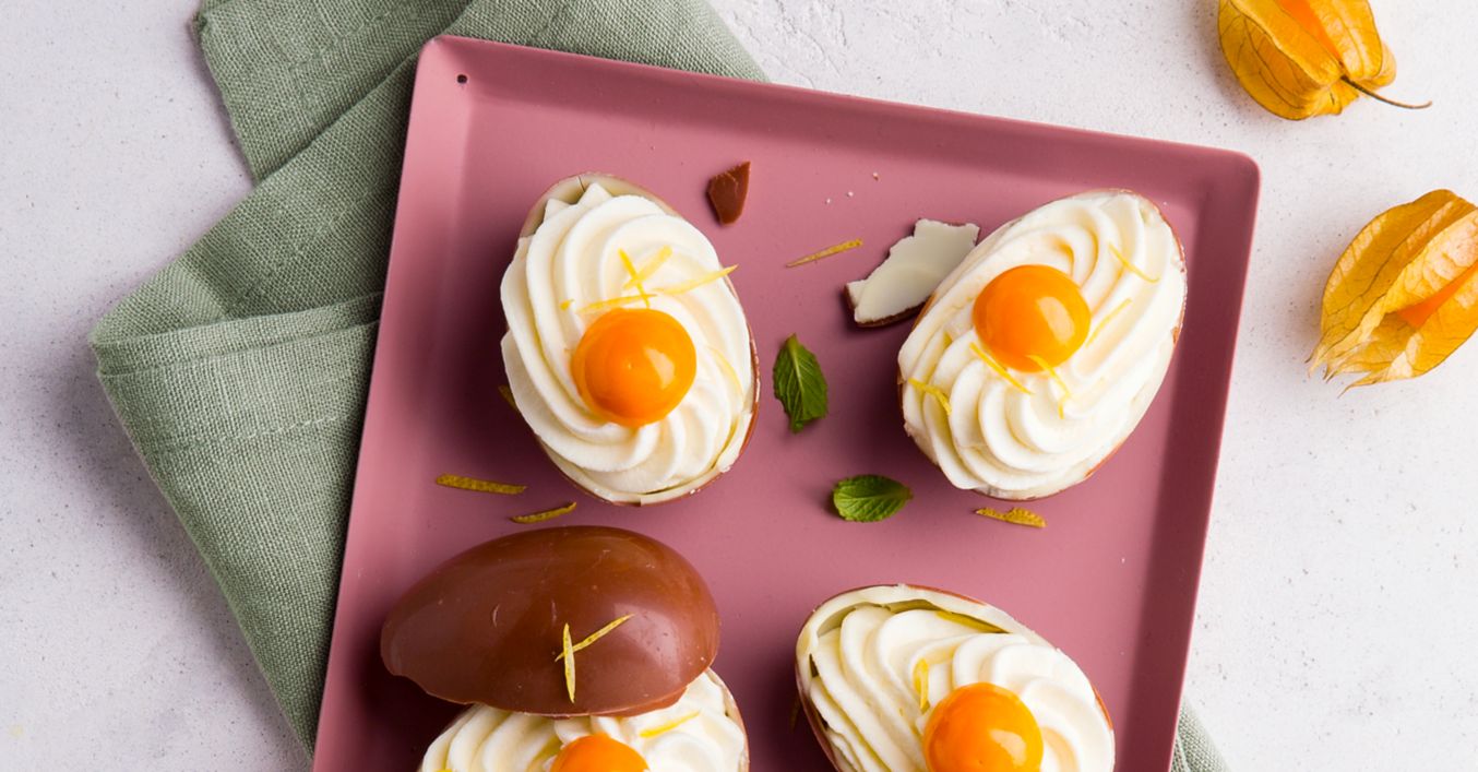 Schokoeier auspacken und halbieren. Frischkäse, Zucker, Zitronensaft und -schale verrühren. Sahne steif schlagen, unterziehen und die Creme vorsichtig in die Eierhälften füllen.