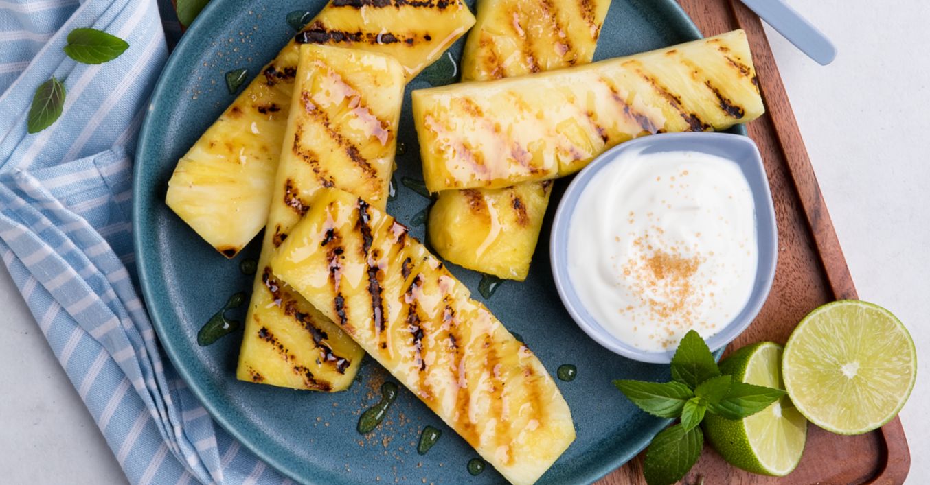 Die Ananasstücke abtropfen lassen und circa 3 bis 4 Minuten von jeder Seite auf den Grill legen, bis sie goldbraune Streifen bekommen. Mit dem Limettendip servieren.