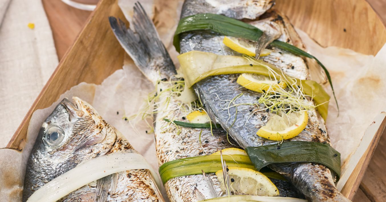 Gegrillte Doraden auf einer Platte anrichten und nach Wusch mit frischen Sprossen garniert servieren.