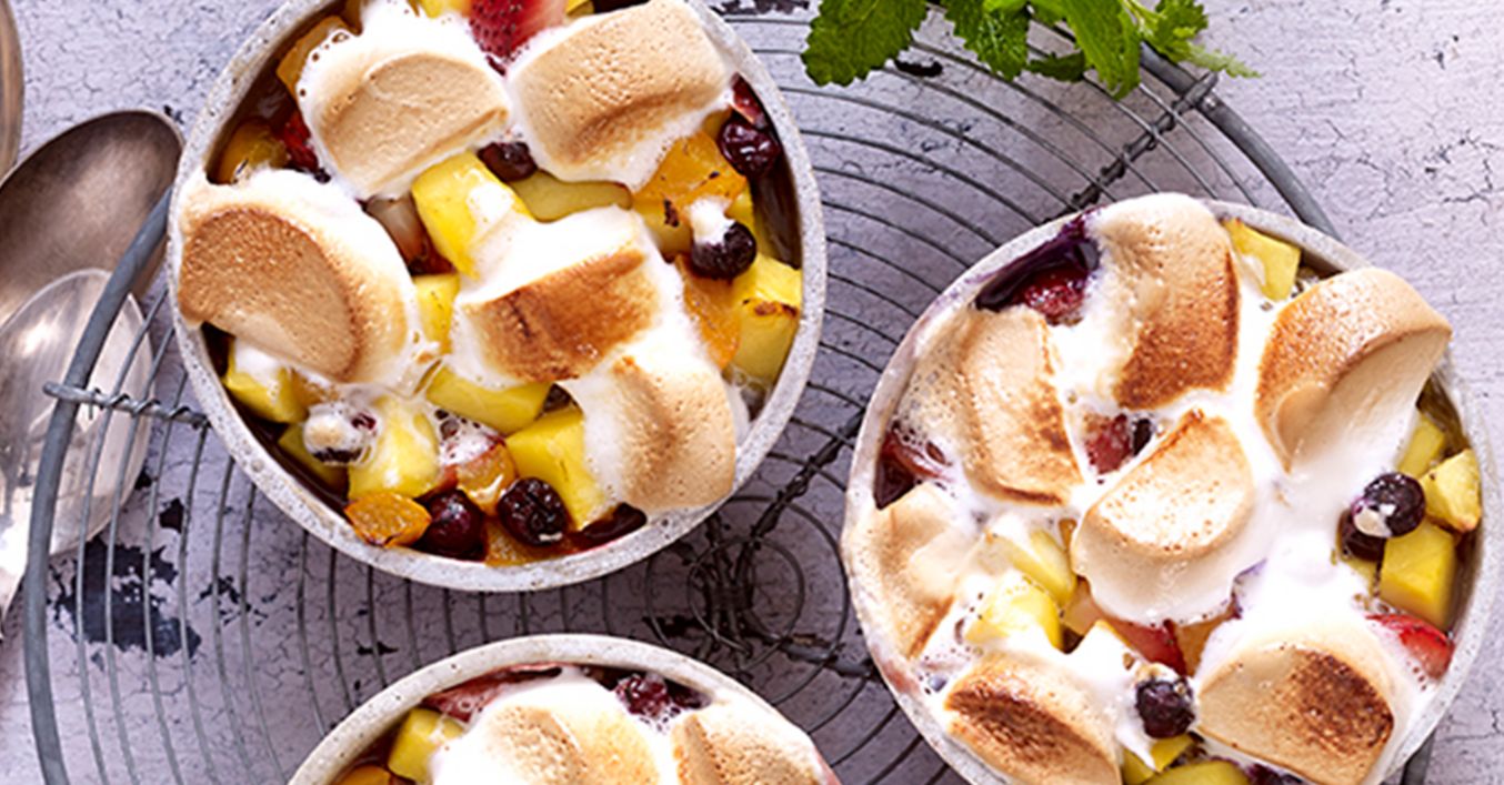 Grill für indirekte Hitze vorbereiten. Marshmallows in kleine Stücke schneiden. Früchte in Portionsschälchen füllen und mit Marshmallows bestreuen, im geschlossenen Grill bei 180 °C indirekter Hitze 6 bis 8 Minuten überbacken und nach Wunsch mit Minze garniert servieren.