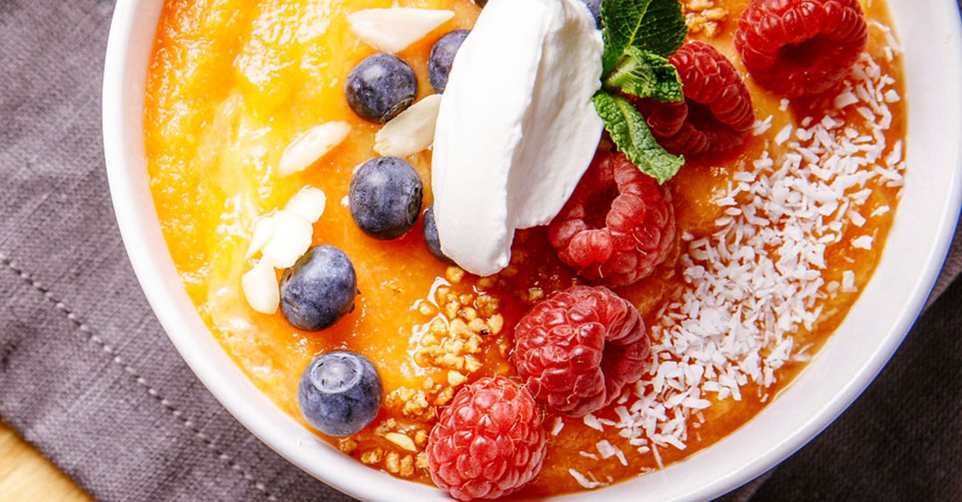 Vegane Schlagcreme steif schlagen. Gegrilltes Obst in einem leistungsstarken Standmixer mit 4 Eiswürfeln und 150 bis 200 Milliliter eiskaltem Mineralwasser cremig pürieren, auf 2 große Schüsseln verteilen, mit Schlagcreme und Beeren garnieren, Kokosraspel darüberstreuen und servieren.