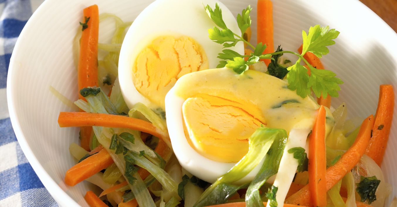 Hartgekochte Eier pellen und halbieren. Eier mit Gemüse, Soße und nach Wunsch mit Petersilie garniert servieren.