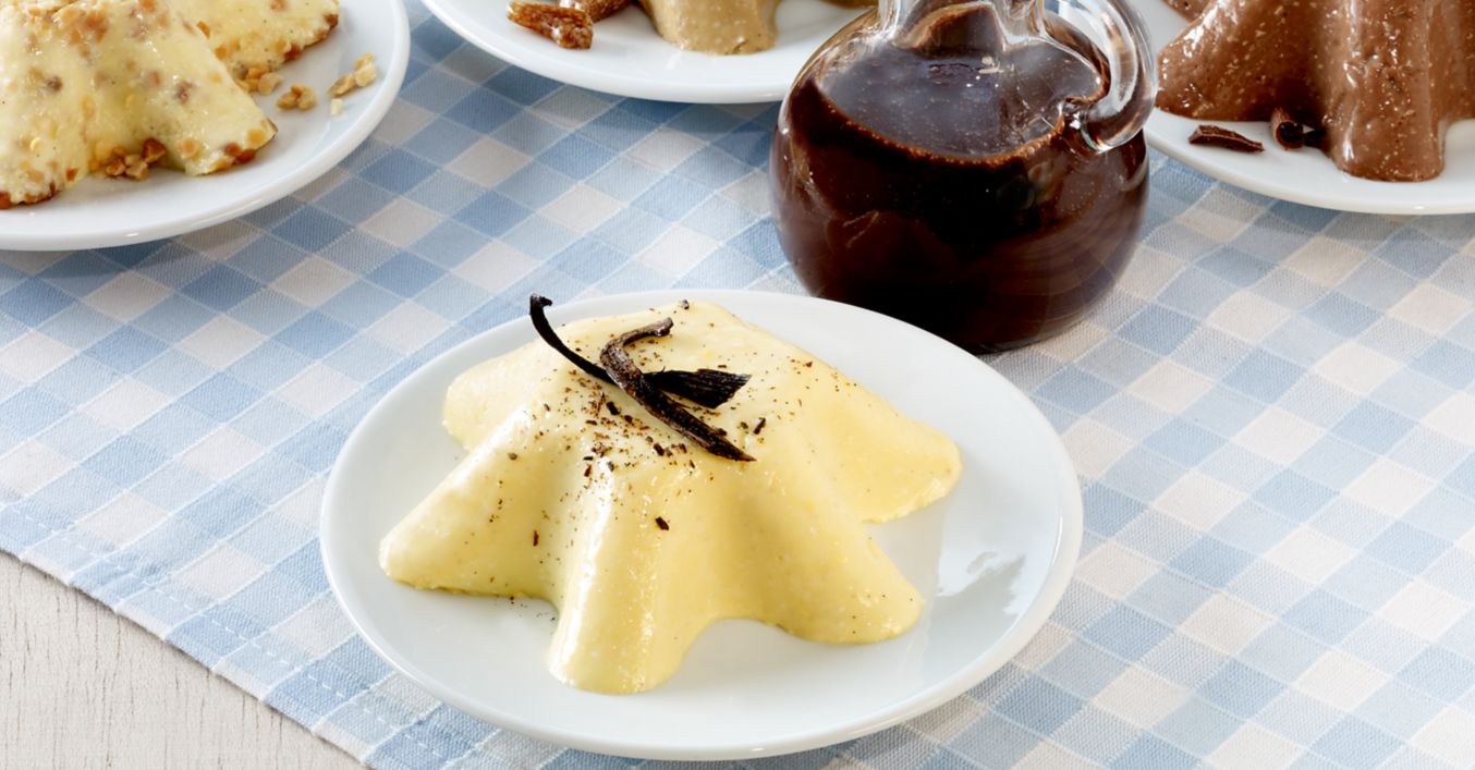 Schokolade grob hacken und in der übrigen heißen Milch schmelzen lassen, dabei ständig umrühren, damit die Milch nicht anbrennt. Pudding auf Teller stürzen, mit der heißen oder kalten Soße anrichten und servieren.