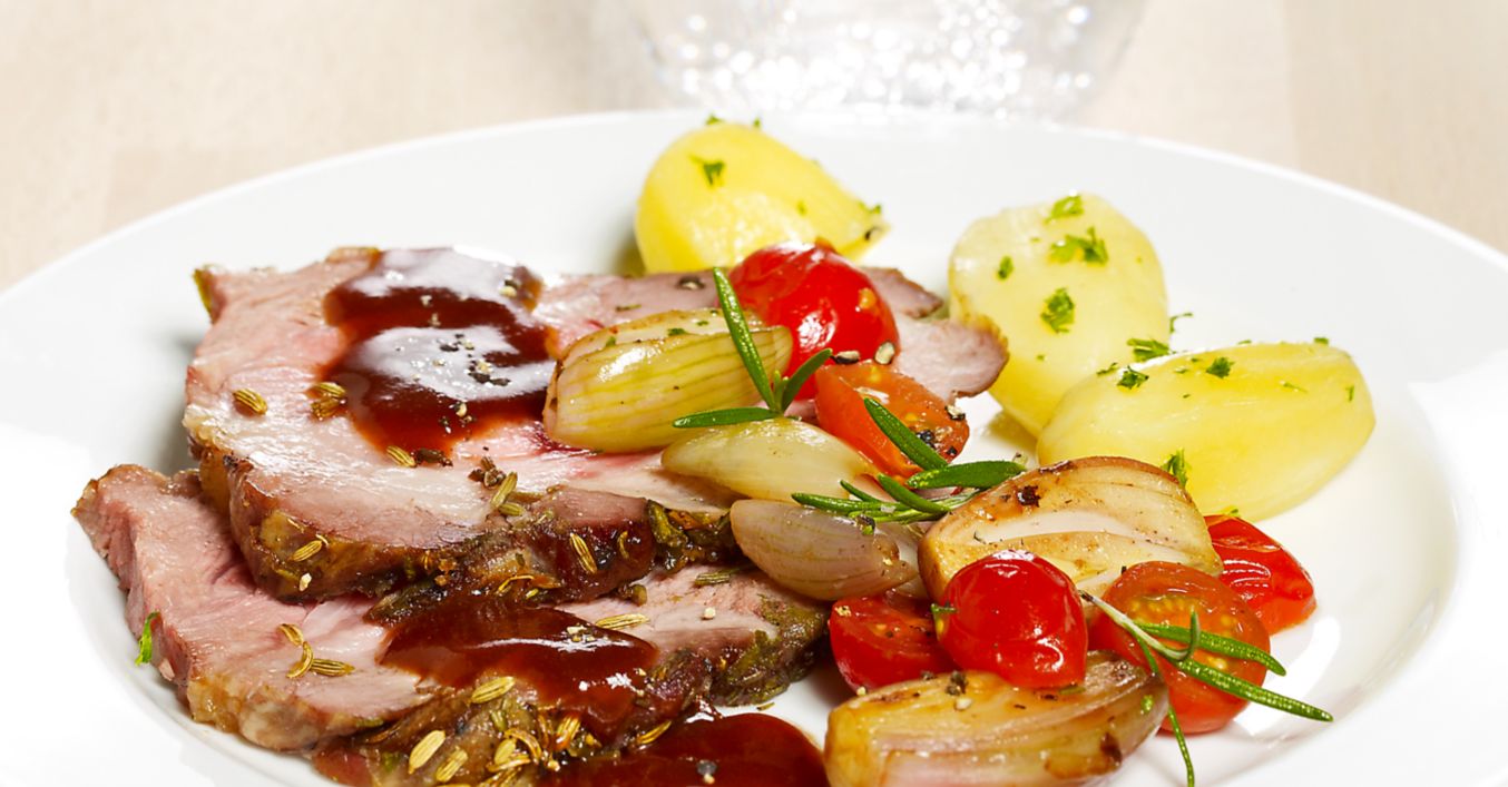 Gekräuterter Schweinebraten mit Tomaten-Schalotten-Gemüse