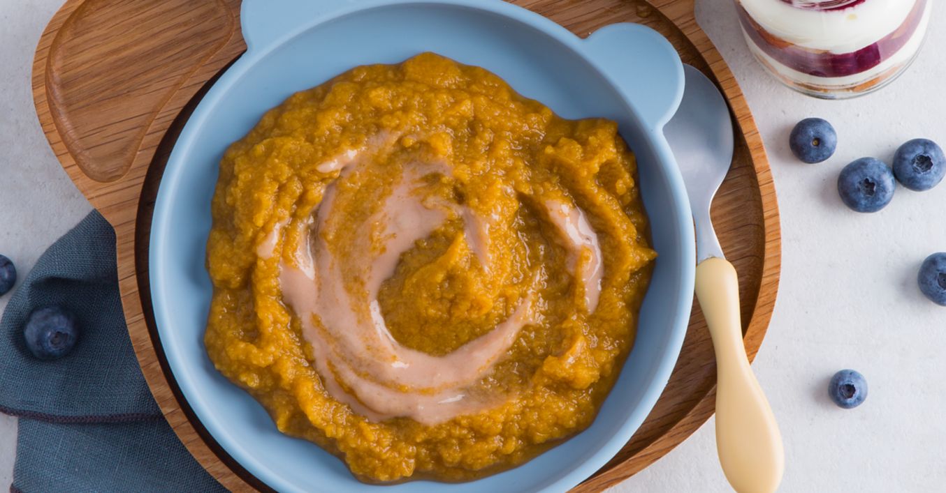 Gemüse-Rindfleisch-Brei als Hauptspeise und Baby-Tiramisu als Dessert füttern.