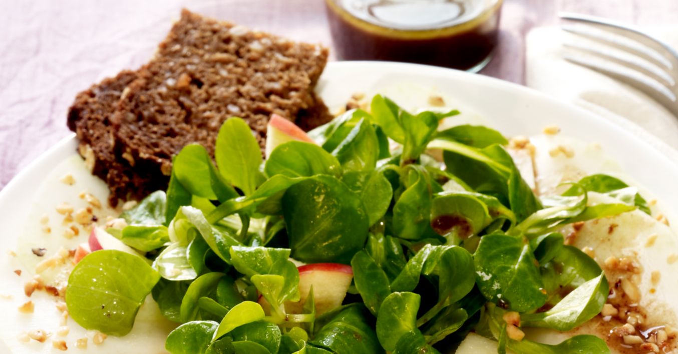 Schwarzbrotscheiben halbieren. Kohlrabischeiben fächerartig auf einer Platte anrichten, Feldsalat in der Mitte arrangieren und mit dem Dressing beträufeln. Mandeln über die Kohlrabi streuen und mit Schwarzbrot servieren.