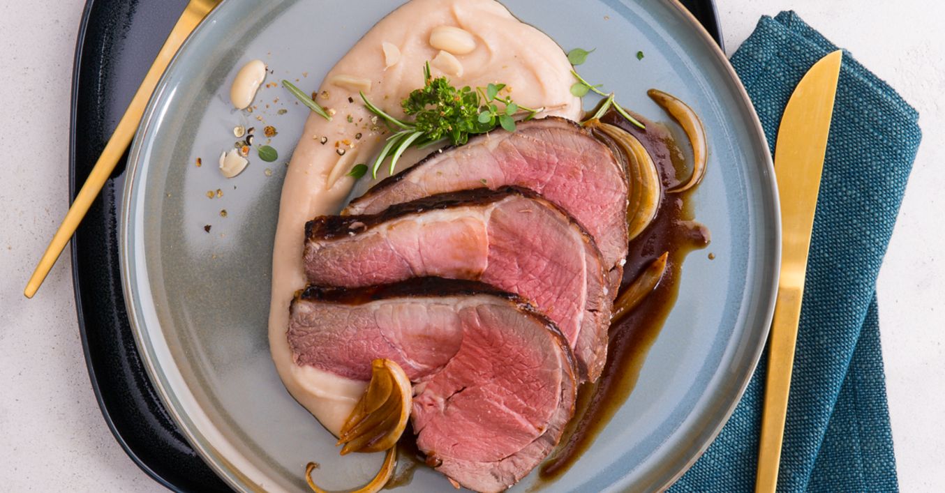 Lammkeule herausnehmen. Soße abschmecken und mit Soßenbinder andicken. Bohnenpüree nach Wunsch mit etwas Olivenöl beträufeln, mit Petersilie bestreuen und dazu servieren.