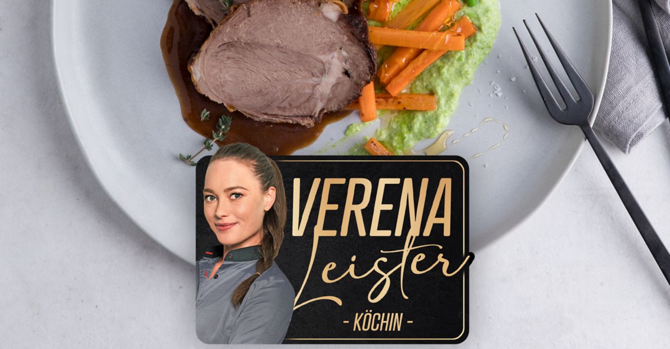Geschmorte Lammkeule mit Erbsencreme und Estragonkarotten