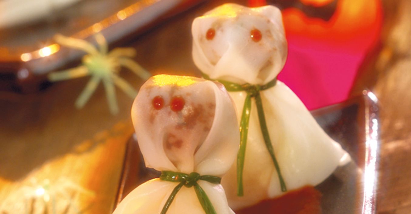 Gespensterchen im Wasserdampf circa 5 Minuten dämpfen, mit 1 Zahnstocher auf 1 Gurkenscheibe feststecken und nach Wunsch mit Tomatensoße Augen auftupfen. Gespensterchen nach Wunsch mit Tomatensoße servieren.