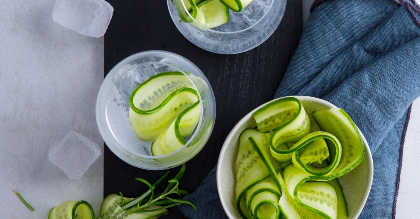 Gurke waschen, in dünne Scheiben hobeln und mit Eiswürfeln in ein bauchiges Glas geben.