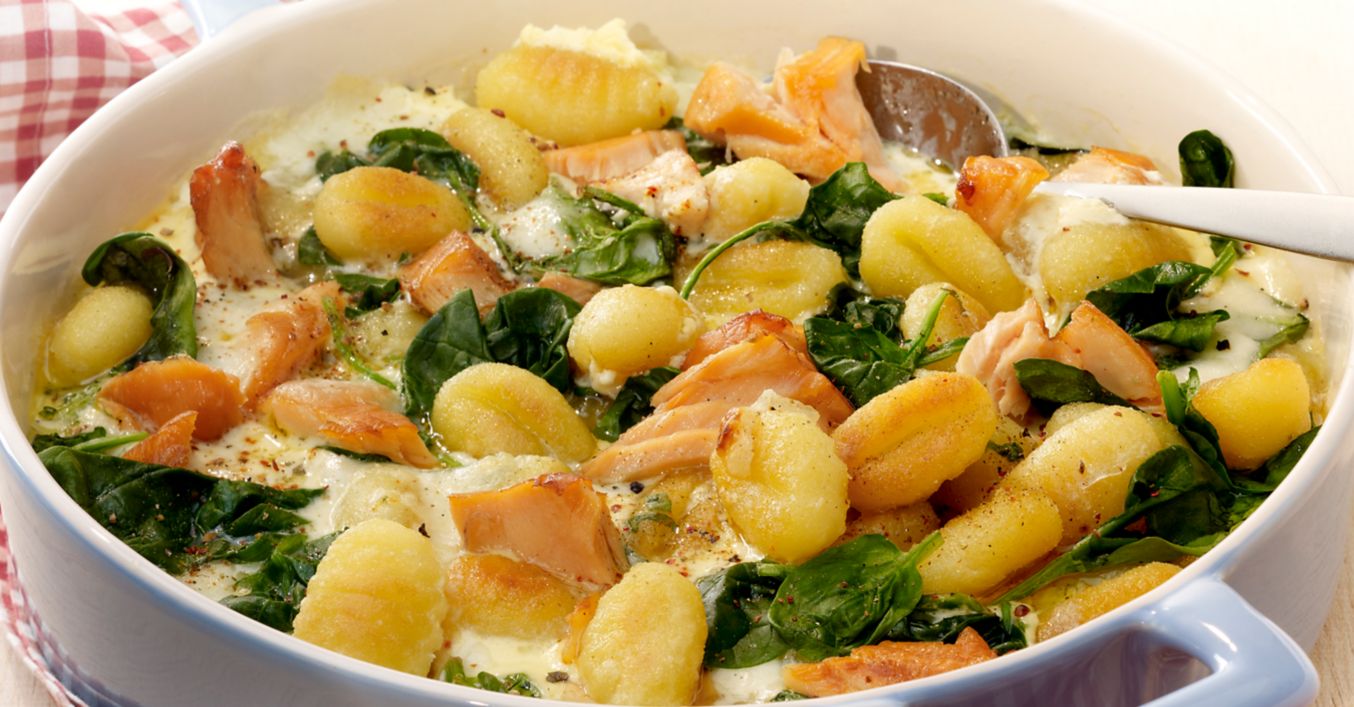Stremellachs in kleine Stücke schneiden, mit Gnocchi und Spinat mischen und in eine Gratinform füllen. Mozzarella abtropfen lassen und fein würfeln.