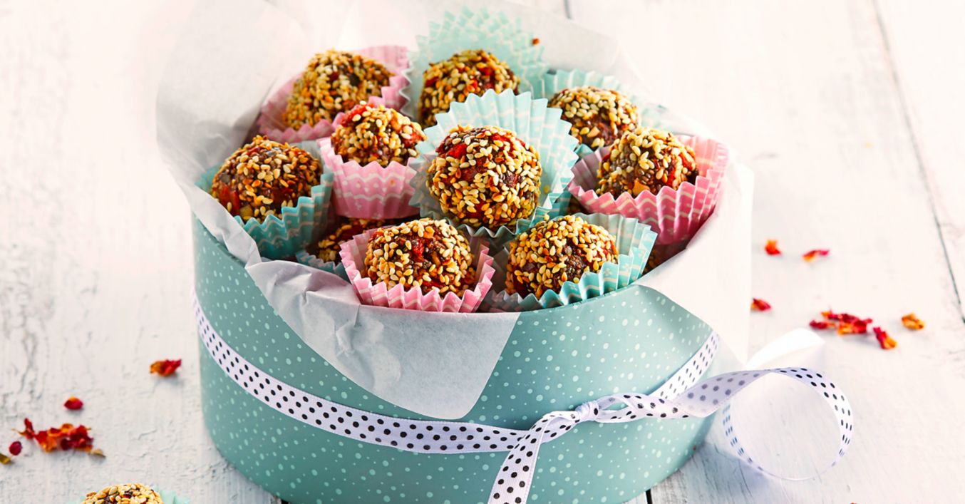Die Kugeln in ein Glas oder eine Dosen füllen. Und mit einer Schleife verzieren. Kühl aufbewahren und möglichst frisch genießen.