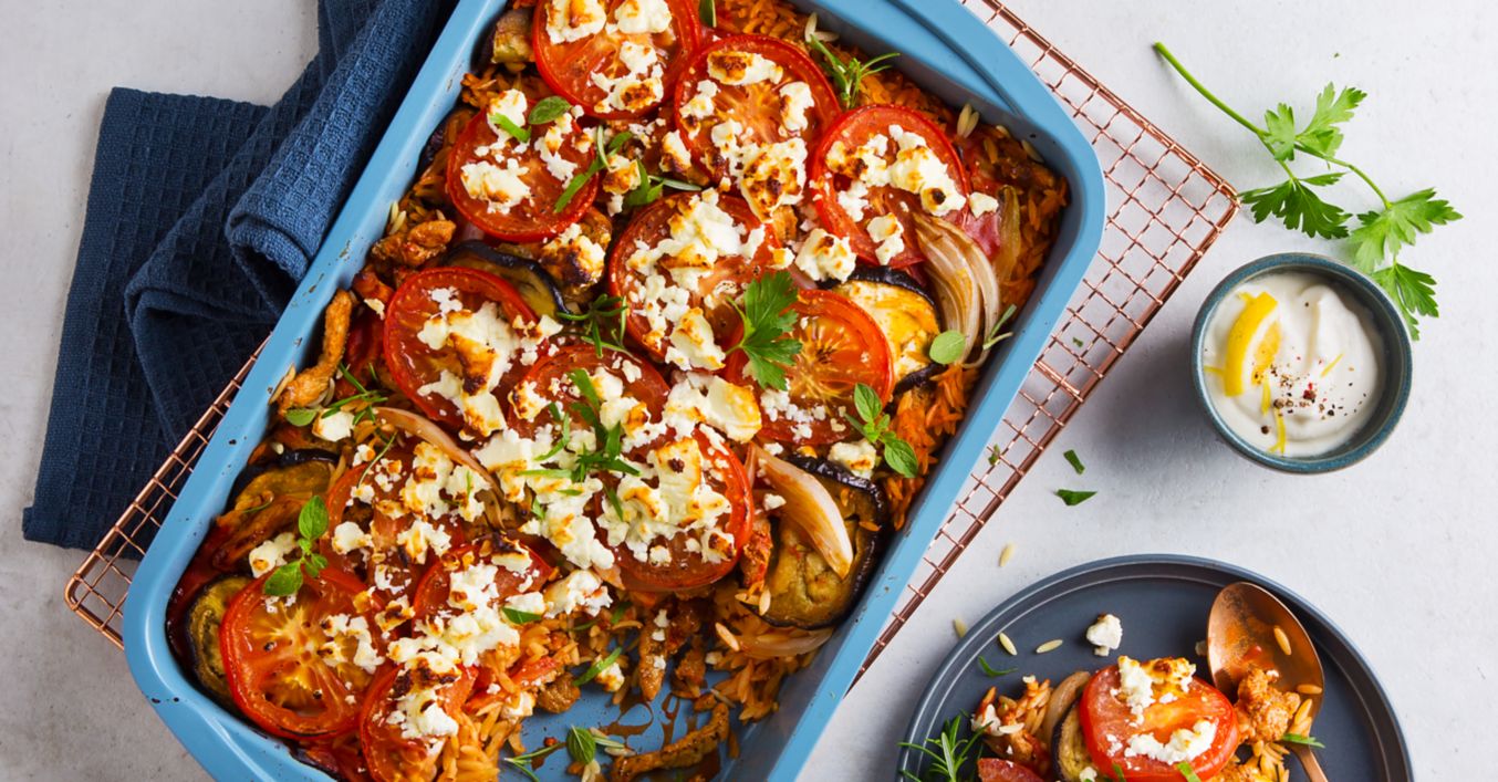 Auflauf mit den Tomatenscheiben belegen, Fetakäse grob darüber bröseln und 30 bis 35 Minuten im Ofen backen.