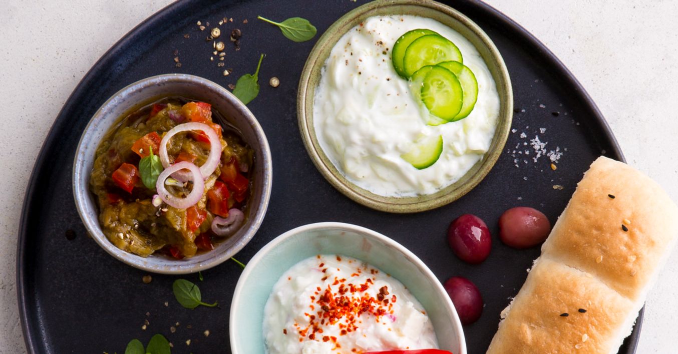 Für die Tirosalata Feta mit einer Gabel fein zerdrücken. Zwiebel und Knoblauch abziehen, Zwiebel fein würfeln, Knoblauch zerdrücken, beides mit Feta unter den Joghurt rühren und mit Chiliflocken, Salz und Pfeffer abschmecken. Die Creme sieht besonders dekorativ aus, wenn Sie diese in kleine ausgehöhlte Snackpaprika füllen und mit roten Zwiebelringen garnieren.