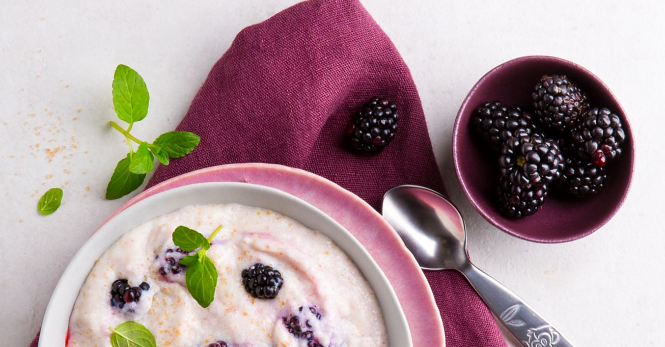 Honig unterrühren. Tiefgekühlte Brombeeren in 4 Schüsseln verteilen. Den heißen Grießbrei über die Beeren geben und vermengen.