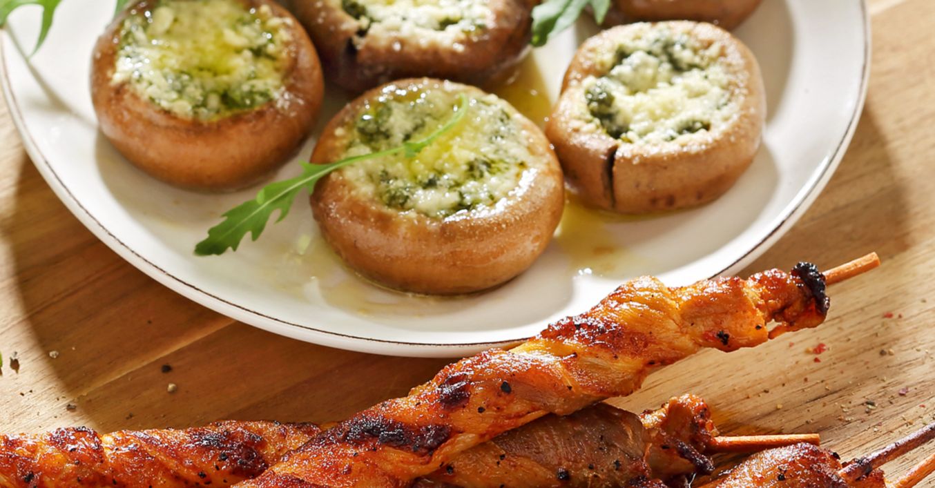 Grillfackeln an gefüllten Champignons mit Rucolabutter