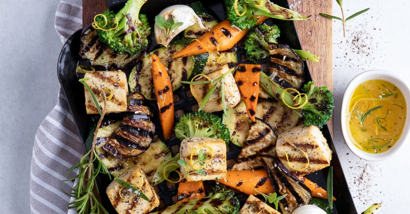 Gemüse auf Grillschalen zubereiten und mit Essig, Salz und Pfeffer abschmecken. Grillgemüse-Salat auf Teller anrichten und servieren.